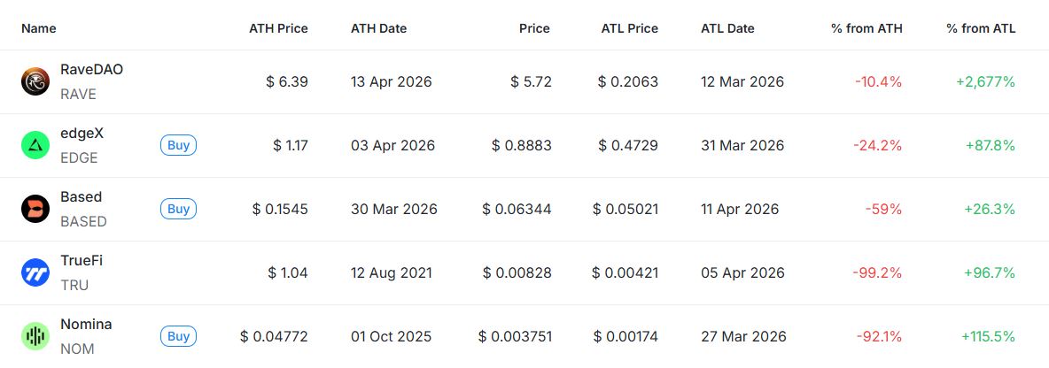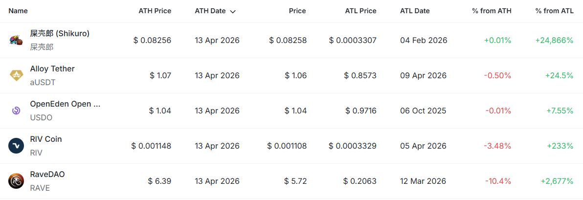 이 외에도 ▲프라임(PRIME)까지 전체 6개 종목이 신고점을 경신했다. 시쿠로(SHIKURO)는 ATH 대비 +0.01%로 사실상 신고가를 재차 경신한 상태이며, 알로이 테더(aUSDT)와 오픈에덴(USDO)은 각각 -0.50%, -0.01%로 고점 부근에서 제한적 조정을 보이고 있다. RIV와 레이브다오(RAVE)는 각각 -3.48%, -10.4%로 고점 대비 하락 폭이 상대적으로 크게 나타났다.