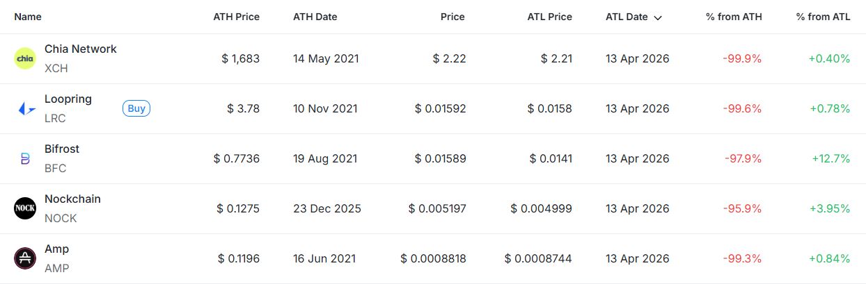 이 외에도 ▲VVS 파이낸스(VVS) ▲에이전트펀(AI)(AGENTFUN) ▲호스코인(HorseCoin) ▲코기AI(CORGIAI) ▲리스타 DAO(LISTA) 전체 10개 종목이 신저점을 경신했다. 치아 네트워크(XCH)와 루프링(LRC)은 각각 ATL 대비 +0.40%, +0.78%로 저점 부근에서 제한적 반등에 그쳤으며, 바이프로스트(BFC)는 +12.7%로 상대적으로 반등 폭이 크게 나타났다. 녹체인(NOCK)과 앰프(AMP) 역시 각각 +3.95%, +0.84%로 저점 대비 소폭 회복 흐름을 보였다.