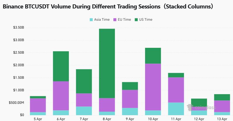 바이낸스 BTCUSDT 거래량은 아시아 시간대 1억2177만 달러, 유럽 시간대 4억6624만 달러, 미국 시간대 2억5258만 달러로 집계됐다.