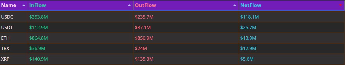 순유입 상위 종목은 USD코인(USDC)으로, 하루 1억1810만 달러의 순유입을 기록했다. 이어 테더(USDT) 2570만 달러, 이더리움(ETH) 1390만 달러, 트론(TRX) 1290만 달러, XRP 560만 달러 순으로 집계됐다.