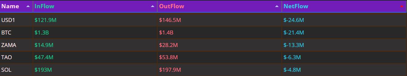 순유출 상위권에서는 USD1이 약 2460만 달러 순유출로 가장 큰 자금 이탈을 보였으며, 비트코인(BTC) 2140만 달러, ZAMA 1330만 달러, 비텐서(TAO) 630만 달러, 솔라나(SOL) 480만 달러 순으로 자금 유출이 이어졌다.