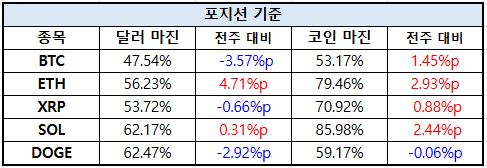 포지션 기준에서는 이더리움(ETH)은 달러 기준 마진이 56.23%로 상승하며 전주 대비 4.71%p 확대됐고, 코인 기준 역시 79.46%로 2.93%p 증가하며 롱 포지션 쏠림이 강화됐다. 솔라나(SOL)도 코인 기준 마진이 85.98%까지 올라서며 전주 대비 2.44%p 증가, 시장 내 강한 롱 편향을 이어갔다. 반면 비트코인(BTC)은 달러 기준 마진이 47.54%로 3.57%p 하락하며 일부 포지션 정리가 나타났고, XRP 역시 달러 기준에서 소폭 감소하며 상대적으로 보수적인 흐름을 보였다.