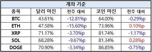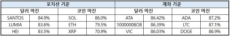 계좌 기준에서는 전반적인 롱 비중 축소가 확인되며 시장 참여자들의 리스크 관리 강화 움직임이 두드러졌다. 비트코인은 달러 기준 마진이 43.61%로 12.81%p 급감했고, 이더리움 역시 15.60%p 하락하며 가장 큰 폭의 포지션 축소가 나타났다. 이는 단기 변동성 확대에 대응한 레버리지 축소로 해석된다. 솔라나는 코인 기준 마진이 81.34%로 0.28%p 증가하며 일부 투자자들이 여전히 상승 방향에 베팅하고 있는 모습이다.