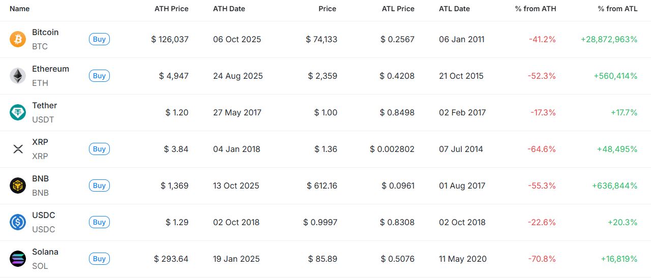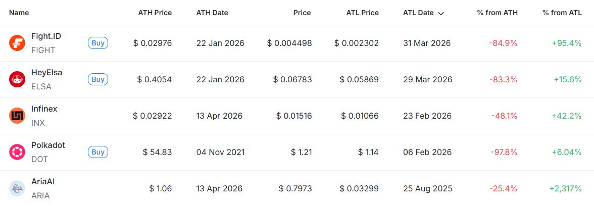 [편집자주] 암호화폐 시장은 하루 새 고점과 저점이 빠르게 바뀌는 고변동성 환경이다. 역대 최고가(ATH)와 역대 최저가(ATL) 경신 종목을 추적하면 강세와 약세 흐름을 조기에 포착할 수 있다. 크립토랭크 기준 시가총액 1000만 달러 이상 종목 중 하루 사이 고점 또는 저점을 경신한 주요 토큰을 정리하고 시가총액 상위 종목과 실시간 국내 인기 자산의 고점 대비 조정률을 함께 분석해 시장 회복 여력과 흐름을 진단한다.
