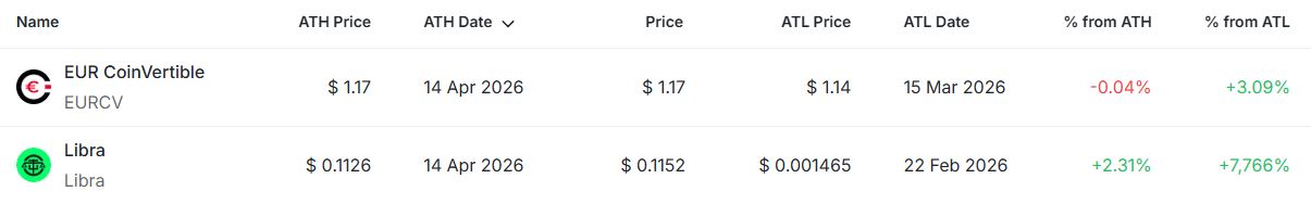 이날 현재까지 전체 2개 종목이 신고점을 경신했다. 신고점 부근에서 거래되며 시장 전반의 강한 확장보다는 제한적인 상승 흐름이 이어졌다. 특히 EURCV는 ATH에 근접한 수준에서 횡보하는 모습을 보였고, 리브라는 신고점을 돌파하며 상대적으로 강한 상승 모멘텀을 나타냈다. 이날 신저점 경신 종목은 없었다 .