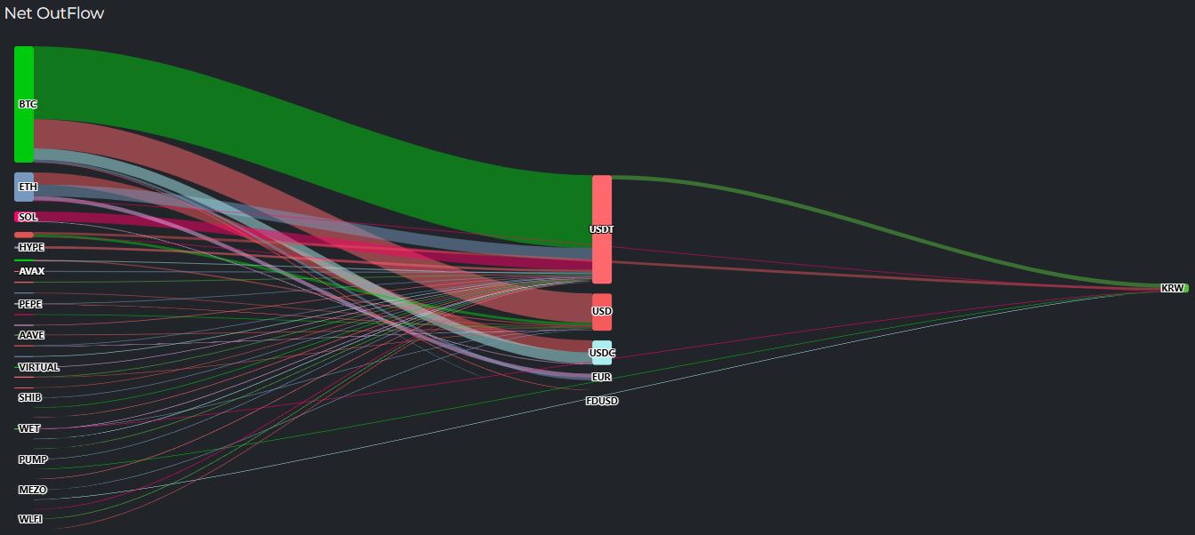 이날 ▲테더(USDT)에 7572만 달러 ▲USD코인(USDC)에 1689만 달러가 결집했으며 ▲달러(USD)로 2570만 달러 ▲원화(KRW)로 595만 달러 상당의 현금화가 이뤄졌다.