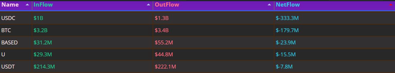 순유출 상위권에서는 USD코인(USDC)이 약 3억3330만 달러 순유출로 가장 큰 자금 이탈을 보였으며, 비트코인(BTC) 1억7970만 달러, BASED 2390만 달러, U 1550만 달러, 테더(USDT) 780만 달러 순으로 자금 유출이 이어졌다.