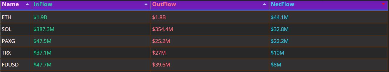 순유입 상위 종목은 이더리움(ETH)으로, 하루 4410만 달러의 순유입을 기록했다. 이어 솔라나(SOL) 3280만 달러, PAXG 2220만 달러, 트론(TRX) 1000만 달러, FDUSD 800만 달러 순으로 집계됐다.