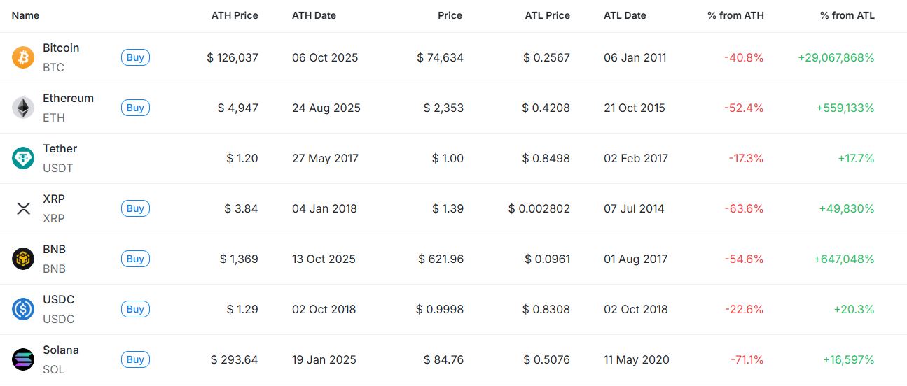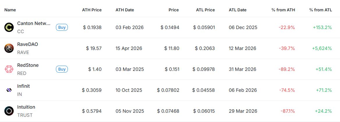 [편집자주] 암호화폐 시장은 하루 새 고점과 저점이 빠르게 바뀌는 고변동성 환경이다. 역대 최고가(ATH)와 역대 최저가(ATL) 경신 종목을 추적하면 강세와 약세 흐름을 조기에 포착할 수 있다. 크립토랭크 기준 시가총액 1000만 달러 이상 종목 중 하루 사이 고점 또는 저점을 경신한 주요 토큰을 정리하고 시가총액 상위 종목과 실시간 국내 인기 자산의 고점 대비 조정률을 함께 분석해 시장 회복 여력과 흐름을 진단한다.
