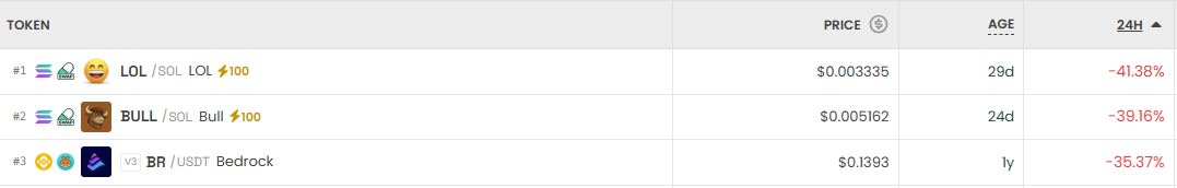 반면 가장 크게 하락한 거래쌍은 LOL(LOL/SOL)로 24시간 기준 -41.38%를 기록했다. 이어 BULL(BULL/SOL)은 -39.16%, BR(BR/USDT)는 -35.37%로 약세 흐름을 보였다.
