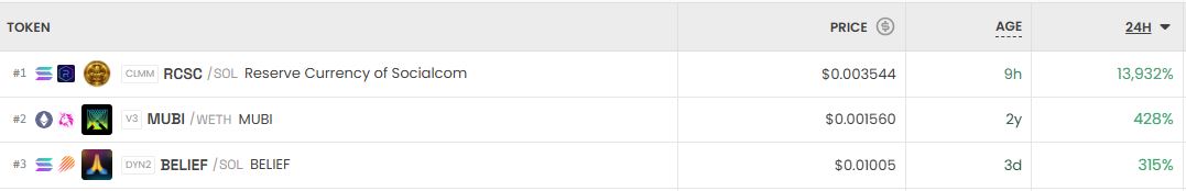 가장 크게 오른 거래쌍은 RCSC(RCSC/SOL)로 24시간 기준 13,932% 상승했다. 이어 MUBI(MUBI/WETH)는 428% 상승했으며, BELIEF(BELIEF/SOL)는 315% 상승했다.