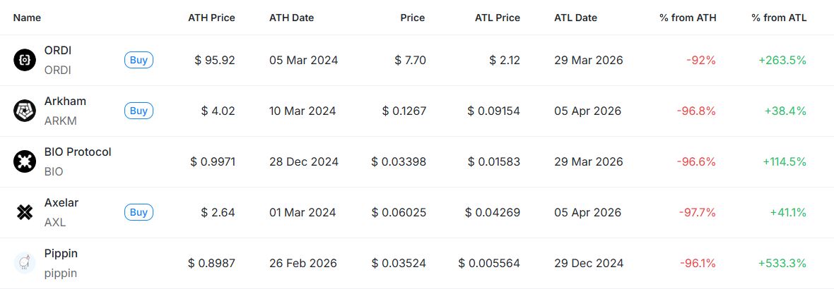 [편집자주] 암호화폐 시장은 하루 새 고점과 저점이 빠르게 바뀌는 고변동성 환경이다. 역대 최고가(ATH)와 역대 최저가(ATL) 경신 종목을 추적하면 강세와 약세 흐름을 조기에 포착할 수 있다. 크립토랭크 기준 시가총액 1000만 달러 이상 종목 중 하루 사이 고점 또는 저점을 경신한 주요 토큰을 정리하고 시가총액 상위 종목과 실시간 국내 인기 자산의 고점 대비 조정률을 함께 분석해 시장 회복 여력과 흐름을 진단한다.