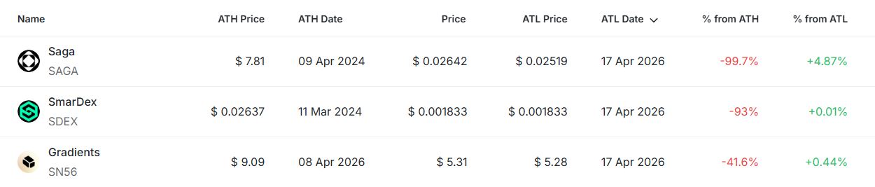 3개 종목이 신저점을 기록했다. 대부분 종목이 저점 대비 제한적인 반등에 그치며 약세 흐름이 이어지고 있다. 특히 사가(SAGA)와 스마덱스(SDEX)는 ATH 대비 큰 폭의 하락 이후 저점 인근에서 머무르며 회복 탄력이 제한적인 모습이다. 전반적으로 시장 내 일부 알트코인이 유동성 이탈 속에 신저점 구간을 형성하며 변동성이 확대되는 양상이 나타났다.