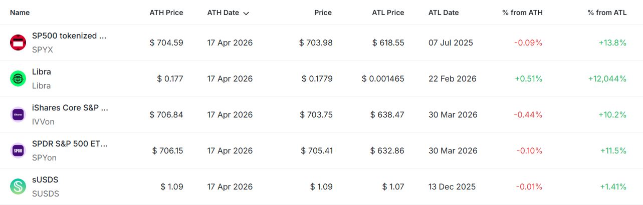 이 외에도 ▲트레이더(TRADOOR) ▲밈코어(M) ▲HONE(SN5) ▲프라임(PRIME) ▲애스터로이드 시바(ASTEROID) ▲온체인 일드 코인(ONYC) 전체 11개 종목이 신고점을 경신했다. 전반적으로 S&P500 연동 토큰과 스테이블 자산군이 ATH 부근에서 좁은 변동폭을 보이며 안정적인 흐름을 나타냈다.