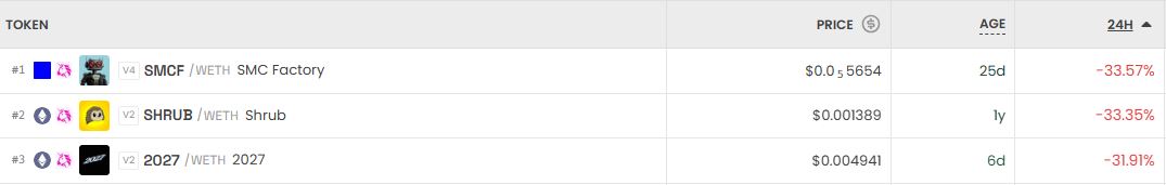반면 가장 크게 하락한 거래쌍은 SMCF(SMCF/WETH)로 24시간 기준 -33.57%를 기록했다. 이어 SHRUB(SHRUB/WETH)은 -33.35%, 2027(2027/WETH)은 -31.91%로 약세 흐름을 보였다.