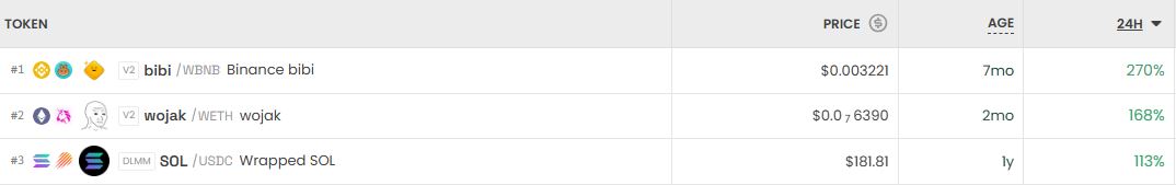 가장 크게 오른 거래쌍은 bibi(bibi/WBNB)로 24시간 기준 270% 상승했다. 이어 wojak(wojak/WETH)은 168% 상승했으며, SOL(Wrapped SOL/USDC)은 113% 상승했다.