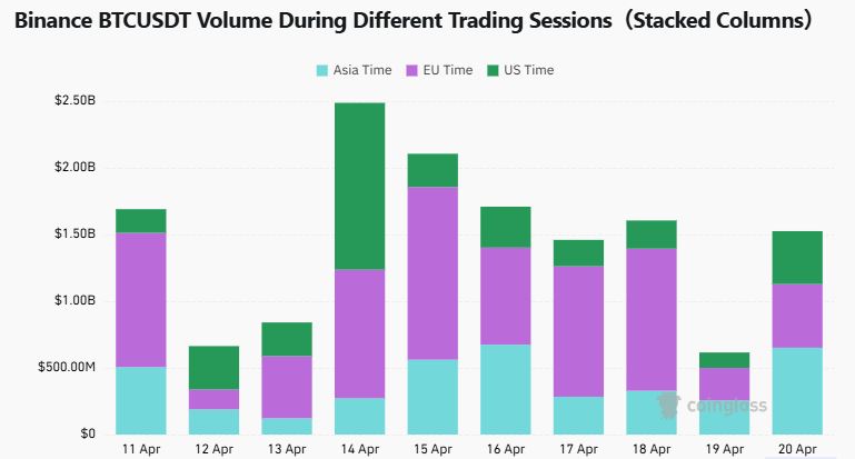 바이낸스 BTCUSDT 거래량은 아시아 시간대 6억5081만 달러, 유럽 시간대 4억7702만 달러, 미국 시간대 3억9736만 달러로 집계됐다.