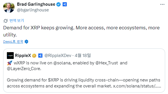 브래드 갈링하우스 리플 CEO는 “XRP는 더 많은 접근성, 더 많은 생태계, 더 많은 유틸리티를 확보했다”고 평가했다. 이는 솔라나 네트워크에서 래핑 XRP(wXRP)가 공식 출시된 직후 나온 발언이다.