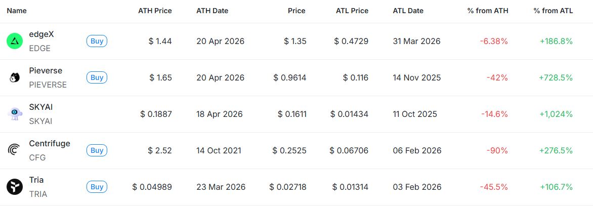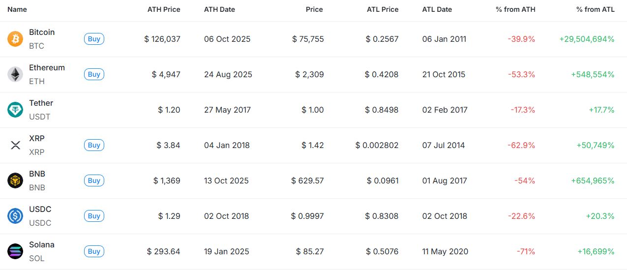 [편집자주] 암호화폐 시장은 하루 새 고점과 저점이 빠르게 바뀌는 고변동성 환경이다. 역대 최고가(ATH)와 역대 최저가(ATL) 경신 종목을 추적하면 강세와 약세 흐름을 조기에 포착할 수 있다. 크립토랭크 기준 시가총액 1000만 달러 이상 종목 중 하루 사이 고점 또는 저점을 경신한 주요 토큰을 정리하고 시가총액 상위 종목과 실시간 국내 인기 자산의 고점 대비 조정률을 함께 분석해 시장 회복 여력과 흐름을 진단한다.