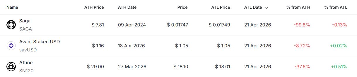 전체 3개 종목이 역대 최저가(ATL)를 경신했다. 사가(SAGA)는 0.01747달러까지 하락하며 ATL 대비 -0.13%의 변동률을 기록, 추가 하락 압력을 강하게 받았다. 반면 아반트스테이크USD(savUSD)와 어파인(SN120)은 신저점 기록 후 각각 0.02%와 0.51% 소폭 반등하며 최저가 수준에서 거래를 이어갔다. 사가(SAGA)의 경우 역대 최고가 대비 99.8% 폭락하며 가장 부진한 흐름을 나타냈다.