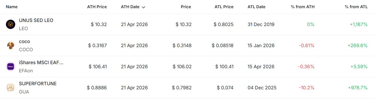총 4개 종목이 역대 최고가(ATH)를 경신했다. 특히 우누스세드레오(LEO)는 10.32달러까지 치솟으며 ATH 대비 0%의 변동률로 고점을 유지하는 강력한 흐름을 보였다. GUA는 최고가 기록 후 현재가 기준 10.2% 하락하며 변동성을 키웠다. COCO와 EFAon 역시 신고점 대비 1% 미만의 미세한 조정만을 거치며 견조한 매수세를 증명했다.