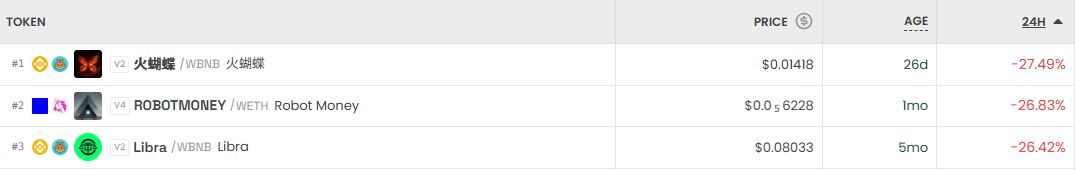 반면 가장 크게 하락한 거래쌍은 火蝴蝶(火蝴蝶/WBNB)로 24시간 기준 -27.49%를 기록했다. 이어 ROBOTMONEY(ROBOTMONEY/WETH)는 -26.83%, Libra(Libra/WBNB)는 -26.42%로 약세 흐름을 보였다.