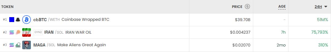 가장 크게 오른 거래쌍은 cbBTC(cbBTC/WETH)로 24시간 기준 51M% 상승했다. 이어 IRAN(IRAN/SOL)은 75,793% 상승했으며, MAGA(MAGA/SOL)는 310% 상승했다.