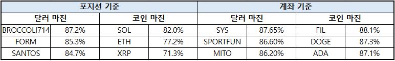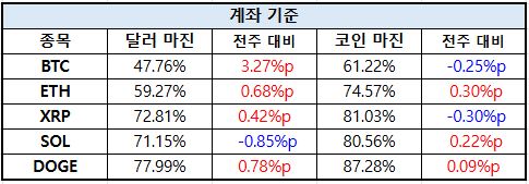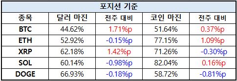 포지션 기준에서는 비트코인(BTC)이 달러 마진 44.62%(+1.71%p), 코인 마진 51.64%(+0.37%p)로 모두 상승하며 견조한 강세 흐름을 이어갔다.