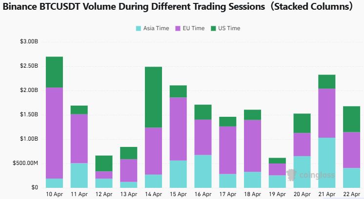 바이낸스 BTCUSDT 거래량은 아시아 시간대 4억0696만 달러, 유럽 시간대 7억3748만 달러, 미국 시간대 5억3199만 달러로 집계됐다.