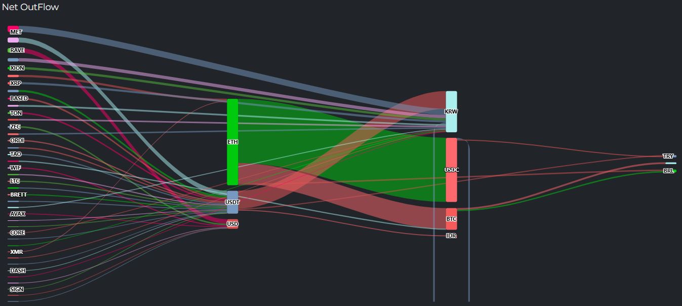 스테이블코인 ▲테더(USDT)에는 약 200만 달러가 모였다가 295만 달러 상당이 빠져 대부분 원화로 전환됐다.