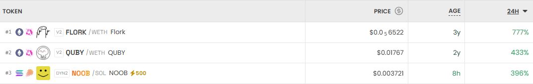 가장 크게 오른 거래쌍은 FLORK(FLORK/WETH)로 24시간 기준 777% 상승했다. 이어 QUBY(QUBY/WETH)는 433% 상승했으며, NOOB(NOOB/SOL)는 396% 상승했다.