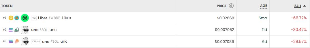반면 가장 크게 하락한 거래쌍은 Libra(Libra/WBNB)로 24시간 기준 -66.72%를 기록했다. 이어 unc(unc/SOL)는 -30.47%, unc(unc/SOL)는 -29.57%로 약세 흐름을 보였다.