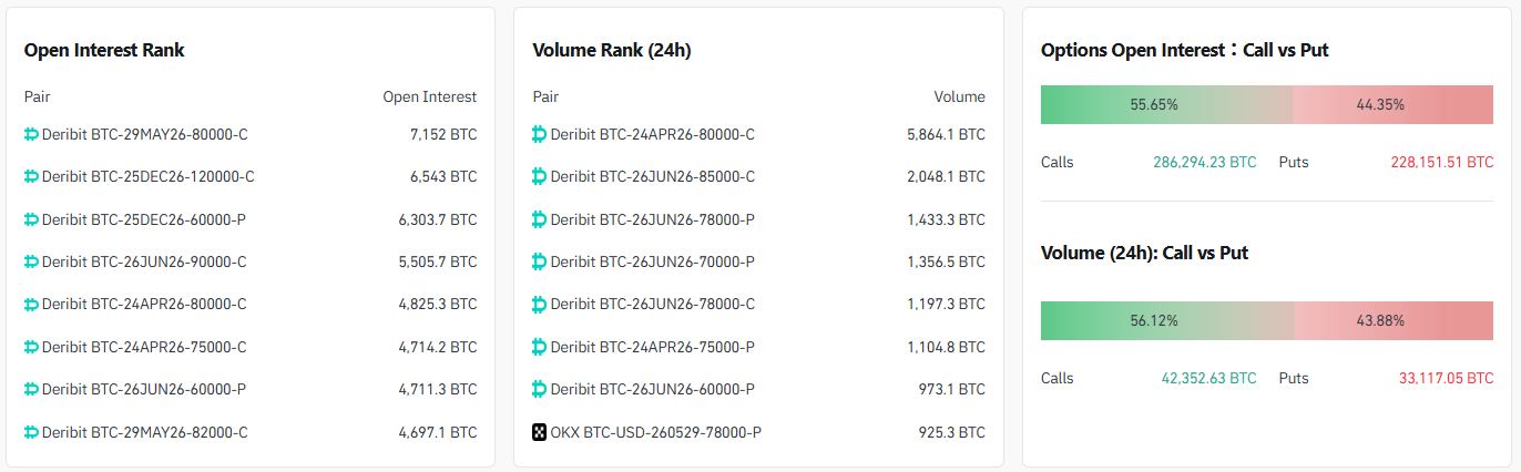 24시간 거래량 기준 상위 계약은 ▲8만 달러 콜옵션(4월 24일·데리비트) ▲8만5000달러 콜옵션(6월 26일·데리비트) ▲7만8000달러 풋옵션(6월 26일·데리비트) 순으로 나타났다.