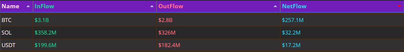 순유입 상위 종목은 비트코인(BTC)으로 하루 2억5710만 달러가 유입됐으며, ▲SOL 3220만 달러 ▲USDT 1720만 달러 ▲USD1 1510만 달러 ▲TRX 1100만 달러 순으로 나타났다.