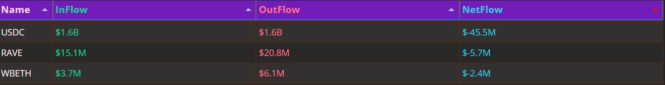 반면 순유출 상위권에서는 ▲USDC 4550만 달러 ▲RAVE 570만 달러 ▲WBETH 240만 달러 순으로 자금 이탈이 확인됐다.
