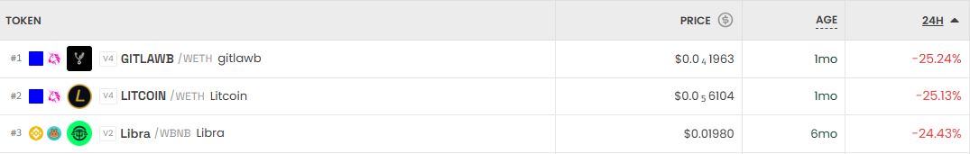 반면 가장 크게 하락한 거래쌍은 GITLAWB(GITLAWB/WETH)로 24시간 기준 -25.24%를 기록했다. 이어 LITCOIN(LITCOIN/WETH)은 -25.13%, Libra(Libra/WBNB)는 -24.43%로 약세 흐름을 보였다.