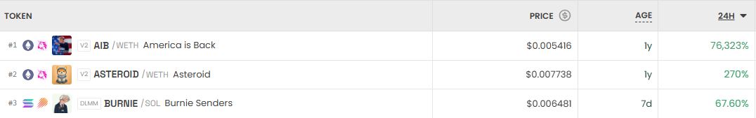 가장 크게 오른 거래쌍은 AIB(AIB/WETH)로 24시간 기준 76,323% 상승했다. 이어 ASTEROID(ASTEROID/WETH)는 270% 상승했으며, BURNIE(BURNIE/SOL)는 67.60% 상승했다.