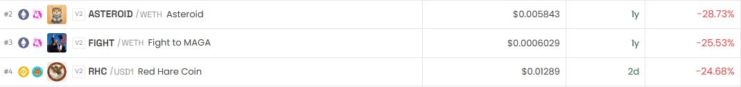 반면 가장 크게 하락한 거래쌍은 ASTEROID(ASTEROID/WETH)로 24시간 기준 -28.73%를 기록했다. 이어 FIGHT(FIGHT/WETH)는 -25.53%, RHC(RHC/USD1)는 -24.68%로 약세 흐름을 보였다.