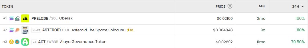 가장 크게 오른 거래쌍은 PRELODE(PRELODE/SOL)로 24시간 기준 160% 상승했다. 이어 ASTEROID(ASTEROID/SOL)는 110% 상승했으며, AGT(AGT/WBNB)는 79.50% 상승했다.