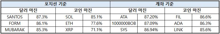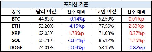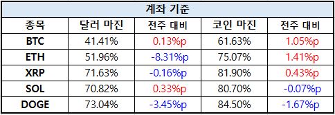 계좌 기준에서는 전반적으로 달러 마진 비중이 약세를 보이는 가운데 종목별 편차가 확대됐다. 이더리움은 달러 마진 비중이 8.31%p 급감한 반면 코인 마진은 1.41%p 증가하며 포지션 기준과 동일하게 자금 이동이 확인됐다. XRP은 달러 마진이 소폭 감소한 반면 코인 마진이 증가해 매수 주체가 코인 담보 계좌로 이동하는 흐름을 보였다. 반면 도지코인(DOGE)은 달러·코인 마진 모두 감소하며 전반적인 참여도 둔화가 나타났다.