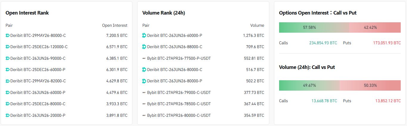 24시간 거래량 기준 상위 계약은 ▲6만 달러 풋옵션(6월 26일·데리비트) ▲8만8000달러 콜옵션(6월 26일·데리비트) ▲7만7500달러 풋옵션(4월 27일·바이비트) 순으로 나타났다.