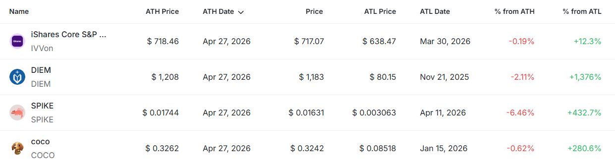 이날 신고점 부근에서 거래된 종목들은 대부분 ATH 대비 소폭 하락 구간에 머물며 단기 조정 흐름을 나타냈다. 특히 IVV(-0.19%)와 COCO(-0.62%)는 ATH와의 괴리가 1% 이내로 제한되며 고점 부근에서 견조한 가격 흐름을 유지했다. 반면 SPIKE는 -6.46% 하락하며 상대적으로 낙폭이 확대돼 변동성이 두드러졌다.