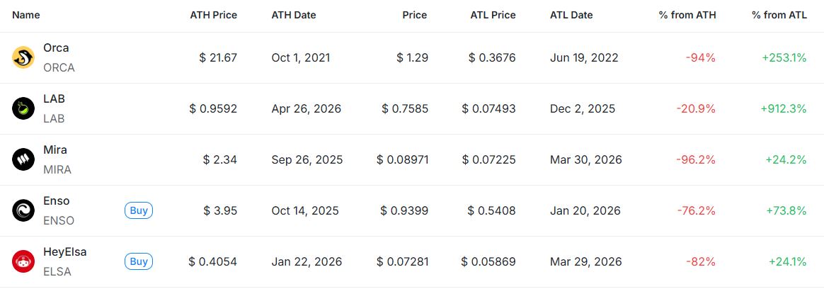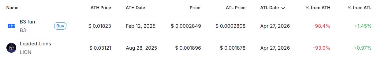 [편집자주] 암호화폐 시장은 하루 새 고점과 저점이 빠르게 바뀌는 고변동성 환경이다. 역대 최고가(ATH)와 역대 최저가(ATL) 경신 종목을 추적하면 강세와 약세 흐름을 조기에 포착할 수 있다. 크립토랭크 기준 시가총액 1000만 달러 이상 종목 중 하루 사이 고점 또는 저점을 경신한 주요 토큰을 정리하고 시가총액 상위 종목과 실시간 국내 인기 자산의 고점 대비 조정률을 함께 분석해 시장 회복 여력과 흐름을 진단한다.