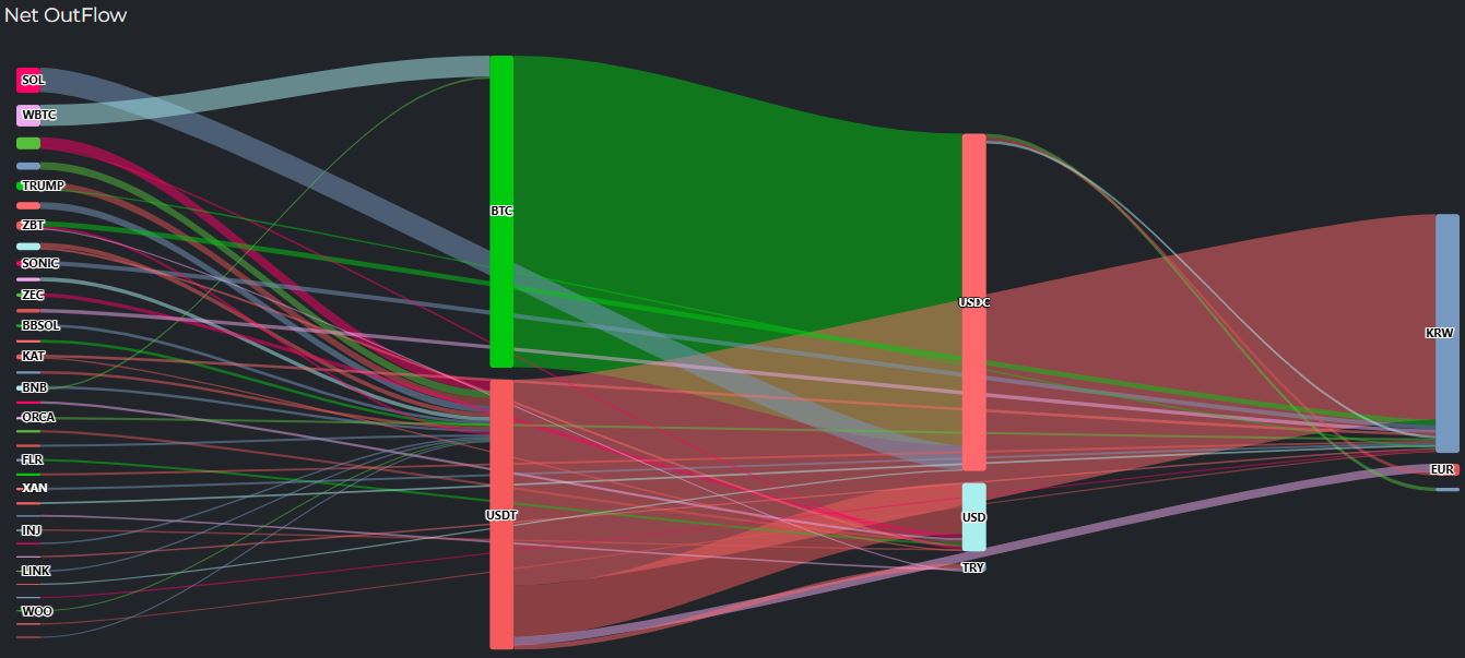 비트코인으로 자금 유입이 이어지는 가운데 일부 물량은 스테이블코인과 원화로 이동하며 매수와 차익 실현이 동시에 진행되는 흐름이 나타났다.