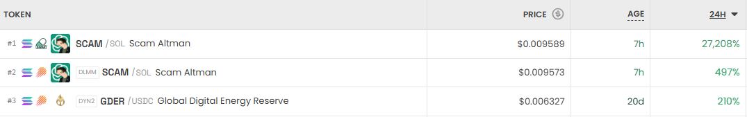 가장 크게 오른 거래쌍은 SCAM(SCAM/SOL)로 24시간 기준 2만7208% 상승했다. 이어 SCAM(SCAM/SOL)은 497% 상승했으며, GDER(GDER/USDC)는 210% 상승했다.