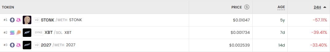 반면 가장 크게 하락한 거래쌍은 STONK(STONK/WETH)로 24시간 기준 -57%를 기록했다. 이어 XBT(XBT/SOL)는 -39%, 2027(2027/WETH)는 -33%로 약세 흐름을 보였다.