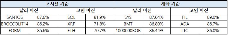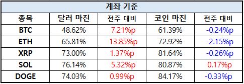 계좌 기준에서는 비트코인(BTC)과 이더리움(ETH)을 중심으로 달러 마진 비중이 크게 확대되며 투자자 포지셔닝이 빠르게 이동하는 흐름이 확인됐다. 비트코인(BTC)은 달러 마진 비중이 48.62%로 전주 대비 7.21%p 증가했으며, 이더리움(ETH)은 65.81%로 13.85%p 급증했다. 솔라나(SOL) 역시 76.14%로 5.32%p 상승했다. 반면 코인 마진은 ETH(-2.15%p), XRP(-0.26%p), DOGE(-0.33%p) 등 주요 종목에서 일제히 감소하거나 제한적인 변동에 그쳤다.
