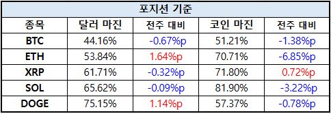 포지션 기준에서는 이더리움(ETH)의 달러 마진 비중이 53.84%로 전주 대비 1.64%p 확대된 반면, 코인 마진은 70.71%로 6.85%p 감소했다. 도지코인(DOGE)은 달러 마진이 75.15%로 1.14%p 증가했지만 코인 마진은 57.37%로 0.78%p 줄었다. 솔라나(SOL)는 코인 마진 비중이 81.90%로 가장 높은 수준을 유지하면서도 전주 대비 3.22%p 감소했다.