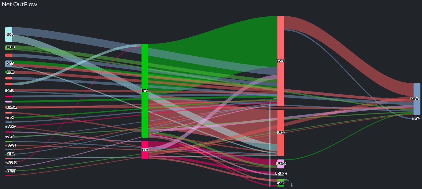 지난 5시간 자금 유출 흐름을 보면 ▲비트코인(BTC)에서 1137만 달러로 가장 많은 자금이 빠졌다. 해당 자금은 USDT와 달러로 움직였다.
