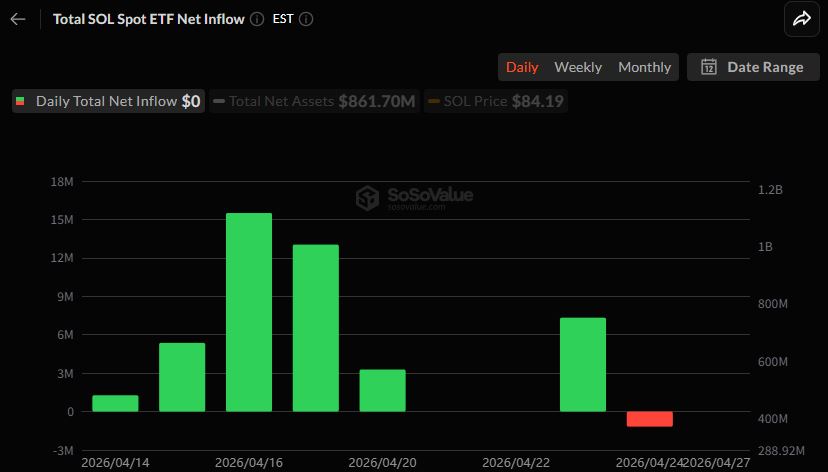 솔라나(SOL) 현물 ETF 시장 역시 보합세를 보였다. 전 거래일(24일, -117만 달러) 얕은 유출세가 있었다가 이날 관망 흐름이 나타났다.